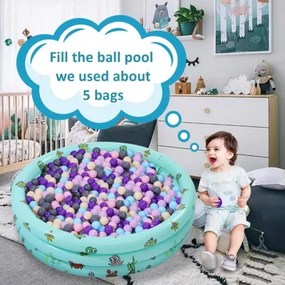 Bolas de piscina de 5,5 cm en tonos Maca Rosa Claro, Lila, Rosa, Verde, Azul y Amarillo. Fabricadas sin BPA, ftalatos ni plomo. Ideales para juegos seguros que estimulan la creatividad y el desarrollo motor.