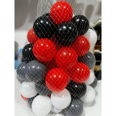 Bolas de piscina de 5,5 cm en colores rojo, negro, gris y blanco. Libres de BPA, ftalatos y plomo. Estimulan el desarrollo motor y el juego libre en entornos seguros, modernos y llamativos.