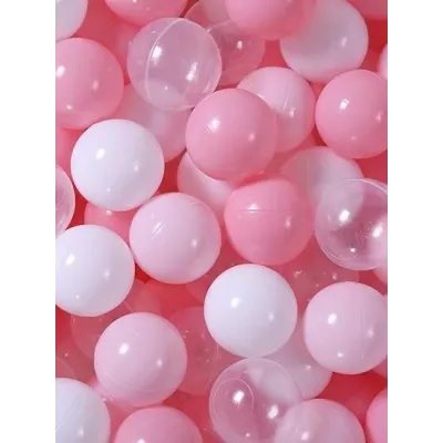 Set de bolas de piscina de 5,5 cm en tonos rosa, blanco y transparente. Seguras, sin BPA, ftalatos ni plomo. Fomentan el desarrollo motor y la creatividad en entornos lúdicos y delicados.