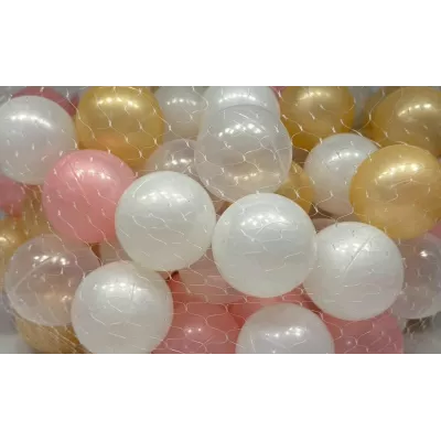 Set de bolas de piscina de 5,5 cm en tonos rosa, dorado, blanco y transparente. Libres de BPA, ftalatos y plomo. Ideales para fomentar el desarrollo motor y el juego sensorial en un entorno seguro y elegante.