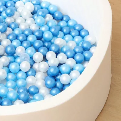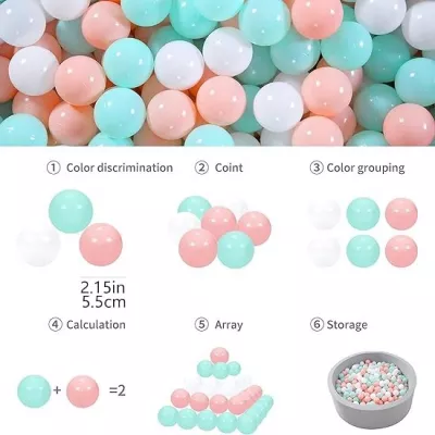 Set de bolas de piscina de 5,5 cm en colores rosa, celeste y blanco perla. Libres de BPA, ftalatos y plomo. Diseñadas para fomentar la creatividad, el desarrollo motor y el juego seguro y armonioso.