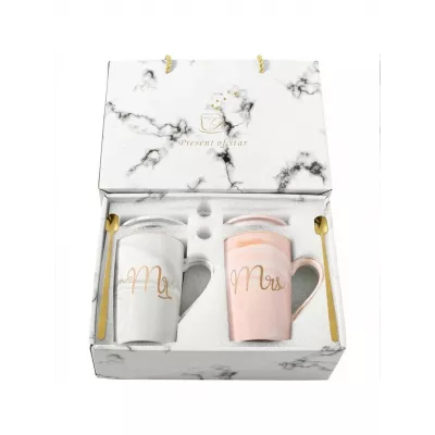 Set de 2 tazas cerámicas marmoleadas con tapa y cucharas. Diseño elegante y funcional, perfectas para café o té. Apta para microondas.