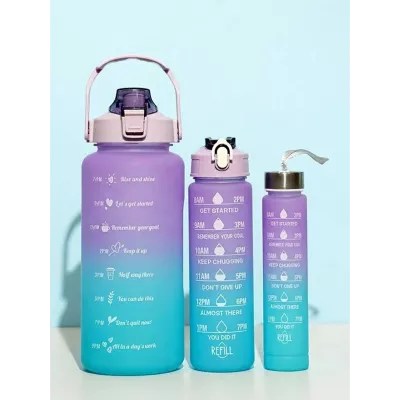 Set de 3 botellas de agua sin BPA, a prueba de fugas y con diseño ergonómico. Incluye capacidades de 2000 ml, 800 ml y 300 ml. Hidratación segura y práctica en todo momento.